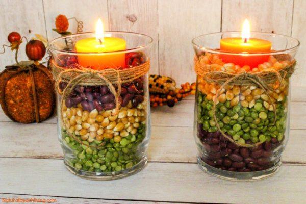 A los niños pequeños les encanta rellenar y vaciar vasos o recipientes, así que esta actividad les gustará, además de que el resultado será muy vistoso y lo podremos utilizar para decorar el salón o sus habitaciones. Podemos usar los elementos que nos gusten: maíz crudo, legumbres, piñas, hojas, frutos secos con cáscara como avellanas, garbanzos, etc. Cuantos más colores, más bonitos quedaran los vasos. Con nuestra ayuda, colocamos una vela encima y atamos unas cuerdas alrededor con un bonito lazo, y tendremos nuestros portavelas listos.