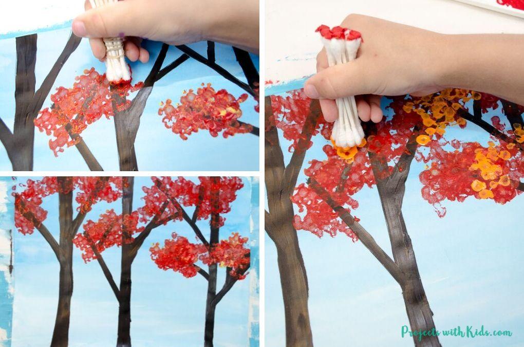 Pintar un paisaje otoñal con pintura y bastoncillos