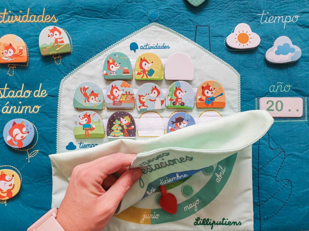 Para la mediana, de la marca Lilliputiens tenemos un calendario de tela que nos tiene enamorados a todos en la familia. Es un panel que incluye los días de la semana, la fecha, el año, el tiempo, las estaciones y los meses, además de los estados de ánimo y las actividades.