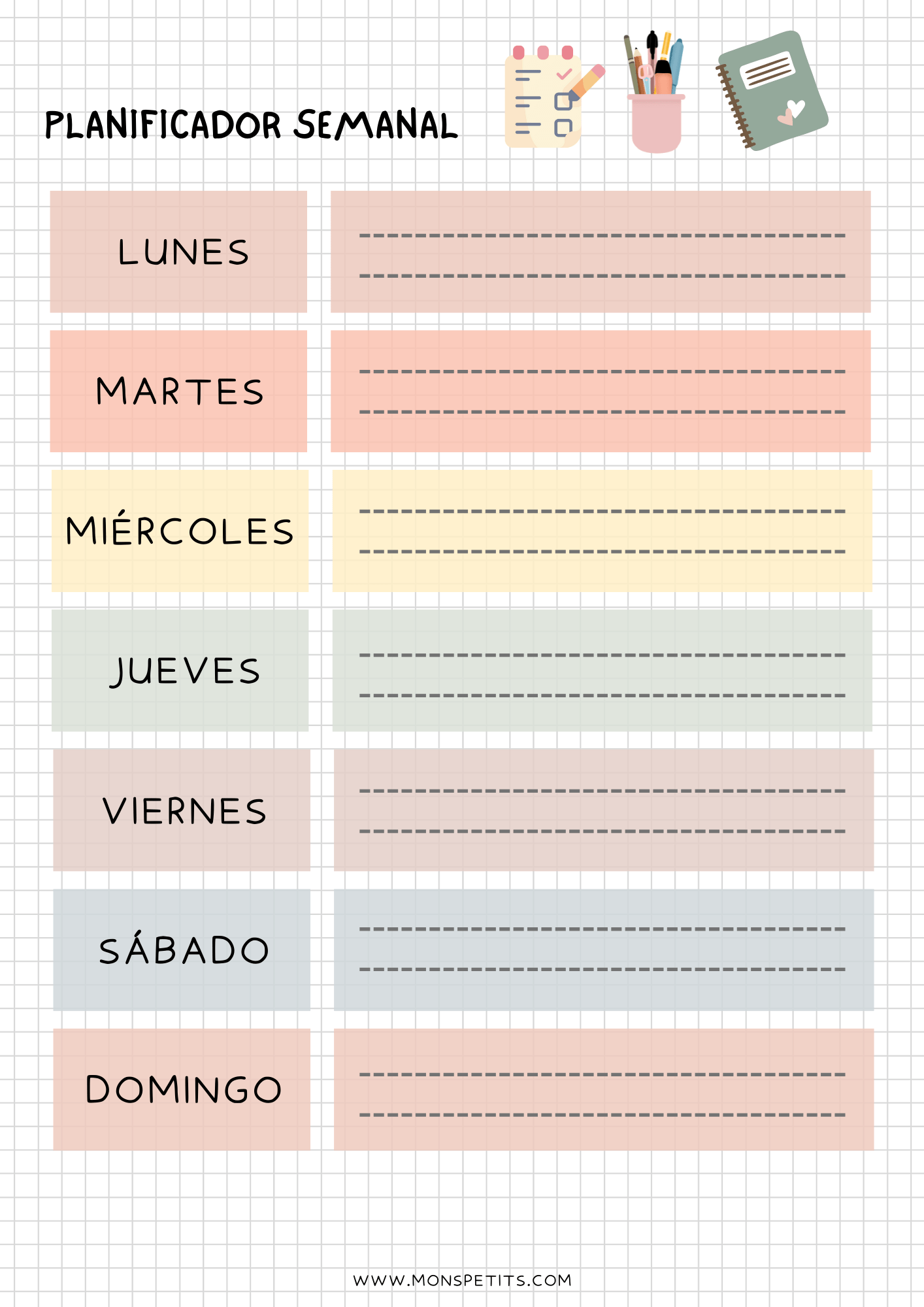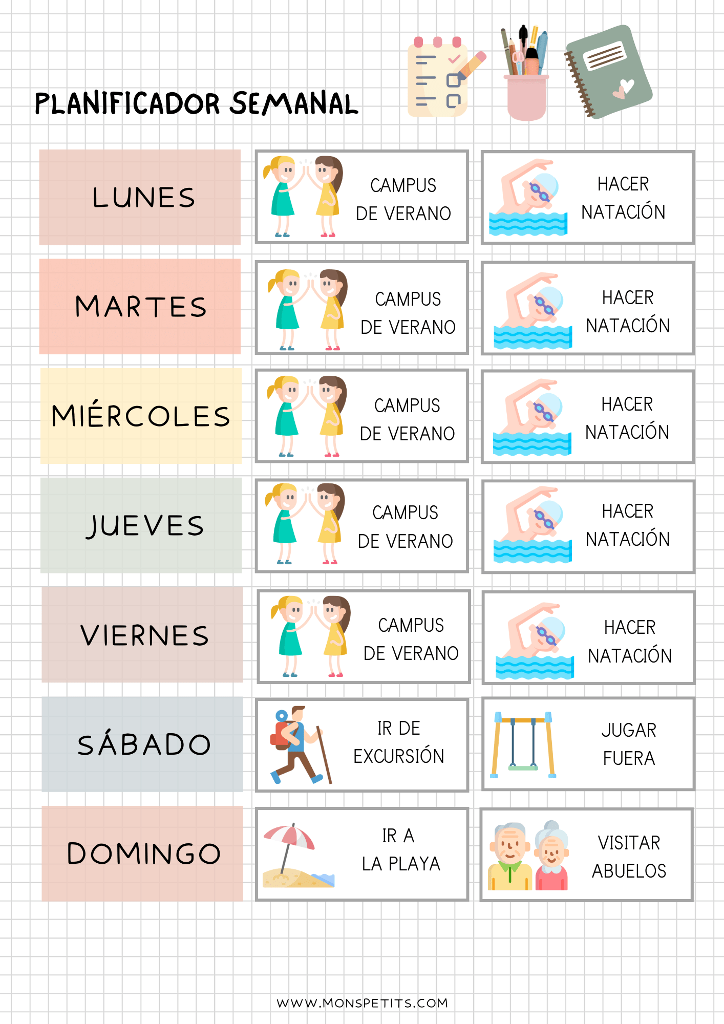 Puedes empezar por planificar la semana a grosso modo: lunes de piscina, martes de ejercicio, miércoles de parque… Las ideas son infinitas, pero si las planificas, te aseguras de incluir actividades variadas que no aburrirán a peques ni a adultos/as. Cuélgalo en alguna parte visible de la casa para que los más pequeños de la casa sepan qué toca cada día. Eso les dará seguridad para afrontar los largos días de verano. Tienes varias plantillas para planificar la semana, algunas con etiquetas y pictogramas, y otras para que los más mayores puedan escribir las actividades.