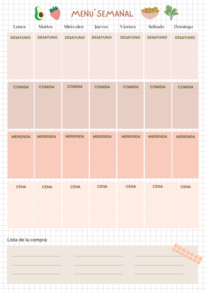 En este pack se incluyen otras plantillas como un menú semanal de lunes a domingo que incluye desayuno, comida, merienda y cena, y una plantilla para el verano, con una lista de los ítems que nos tenemos que llevar a la playa o la piscina y no olvidar nada.