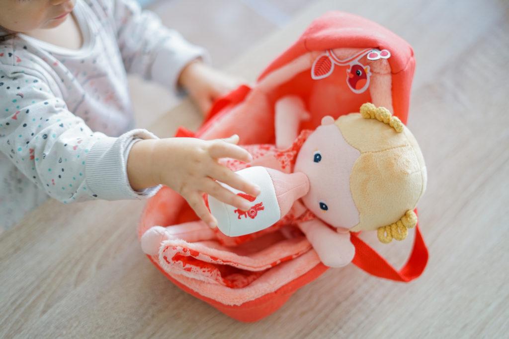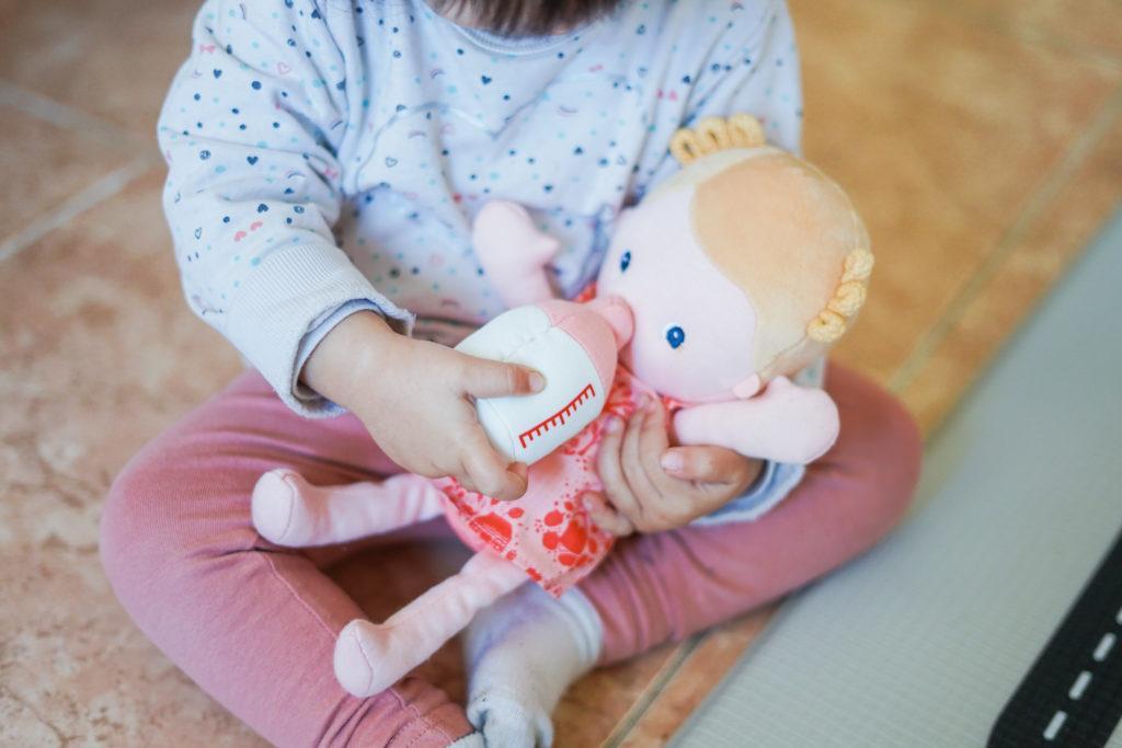 Tenemos una muñeca llamada Lena que es una bebé blandita y con unos colores preciosos. Viene dentro de su capazo y tiene una manta, un biberón y un pequeño peluche para ir a la cama. Desde que Bebé Lena está en casa, la usamos para nuestras rutinas de la noche, porque a nuestra pequeña le cuesta un poco el momento de ir a la cama. Un beso para papá y para los hermanos, y empezamos con nuestro ritual: le damos el biberón a Lena (que además es magnético y se queda pegado en la boquita de la muñeca!), la ponemos en su capazo, le damos su pequeño muñequito y la tapamos.