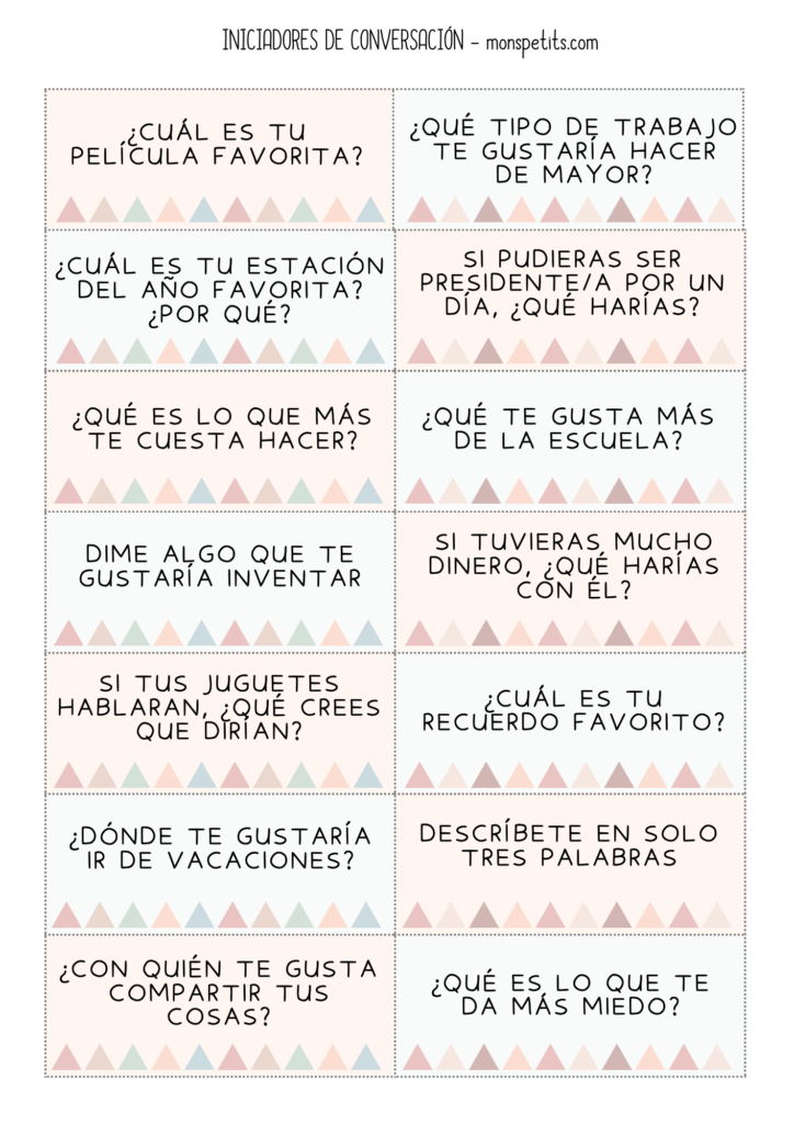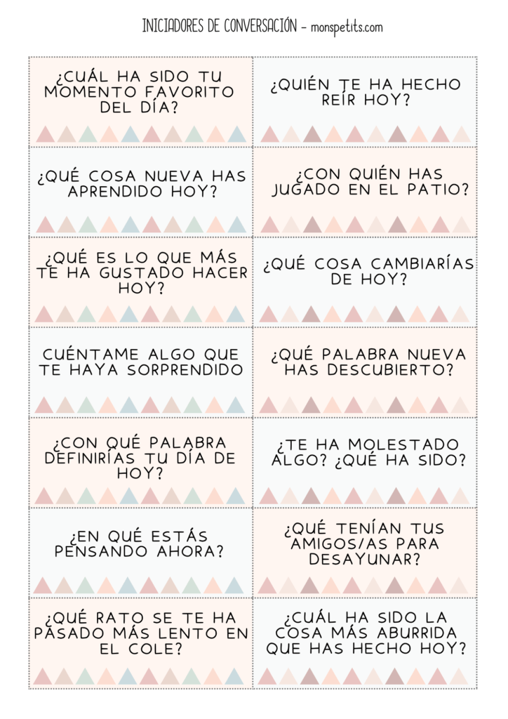 Para ayudar a iniciar esas conversaciones que a veces cuesta un poco o simplemente para pasar un rato divertido, os dejo a continuación un imprimible con 50 tarjetas con iniciadores de conversación, tanto sobre el colegio como la vida en general.