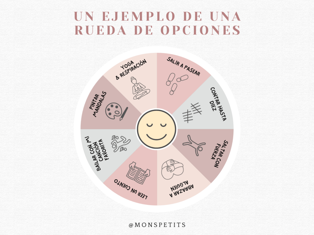 Es importante no negar ni reprimir las emociones, sino validarlas y gestionarlas. Hay recursos muy útiles que pueden ayudar a los niños y niñas a esa gestión de las emociones. Una de ellas es la rueda de las opciones.