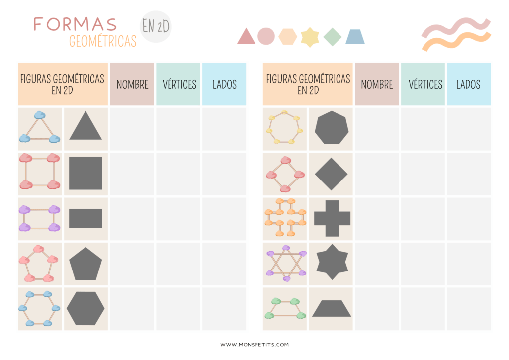 El imprimible incluye además una tabla donde los niños y niñas podrán repasar lo aprendido, apuntando el nombre de cada figura geométrica que aprendan o identifiquen y los vértices y lados de cada forma. También incluye un pequeño póster con los nombres de algunas de las principales figuras geométricas.
