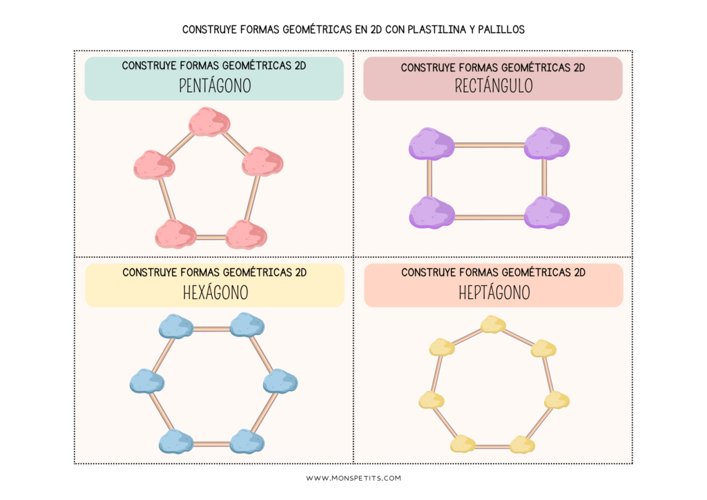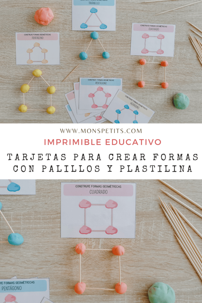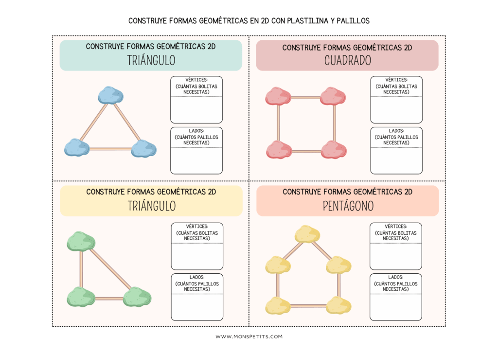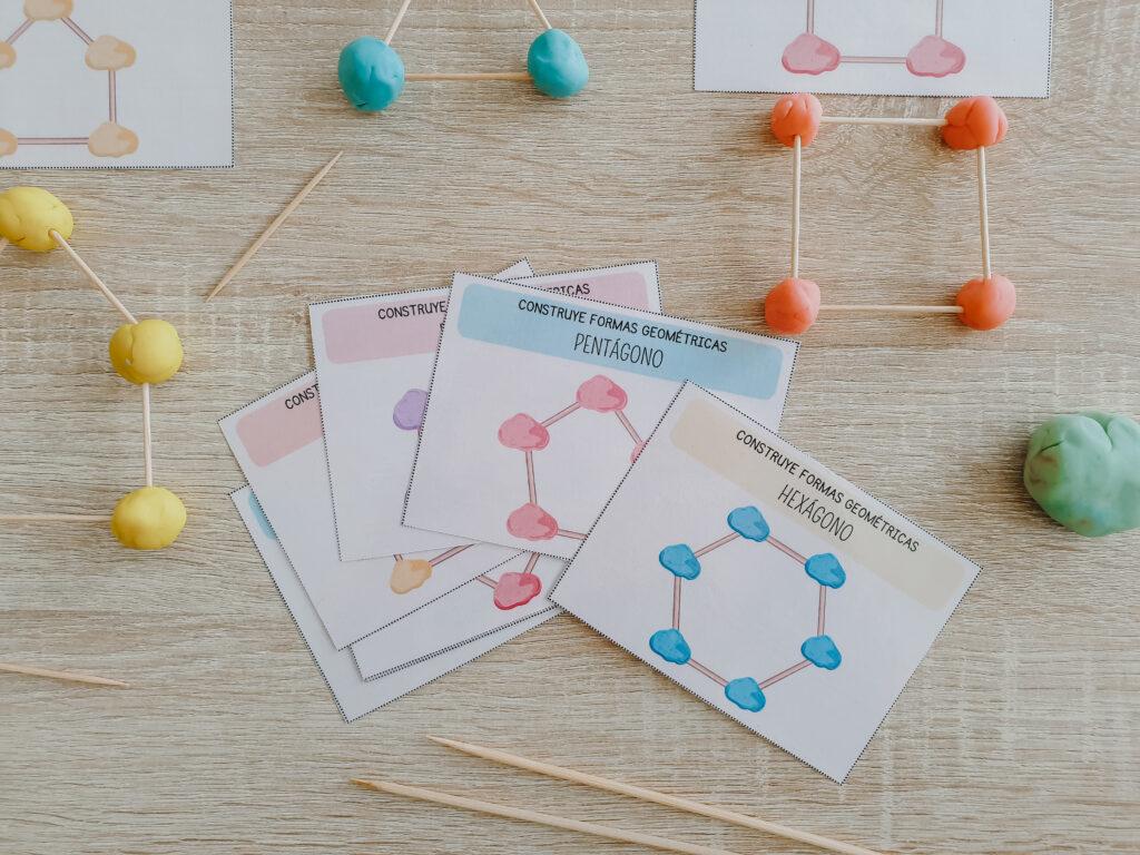 Descarga GRATIS el imprimible de tarjetas para construir figuras geométricas 2D con palillos y plastilina
