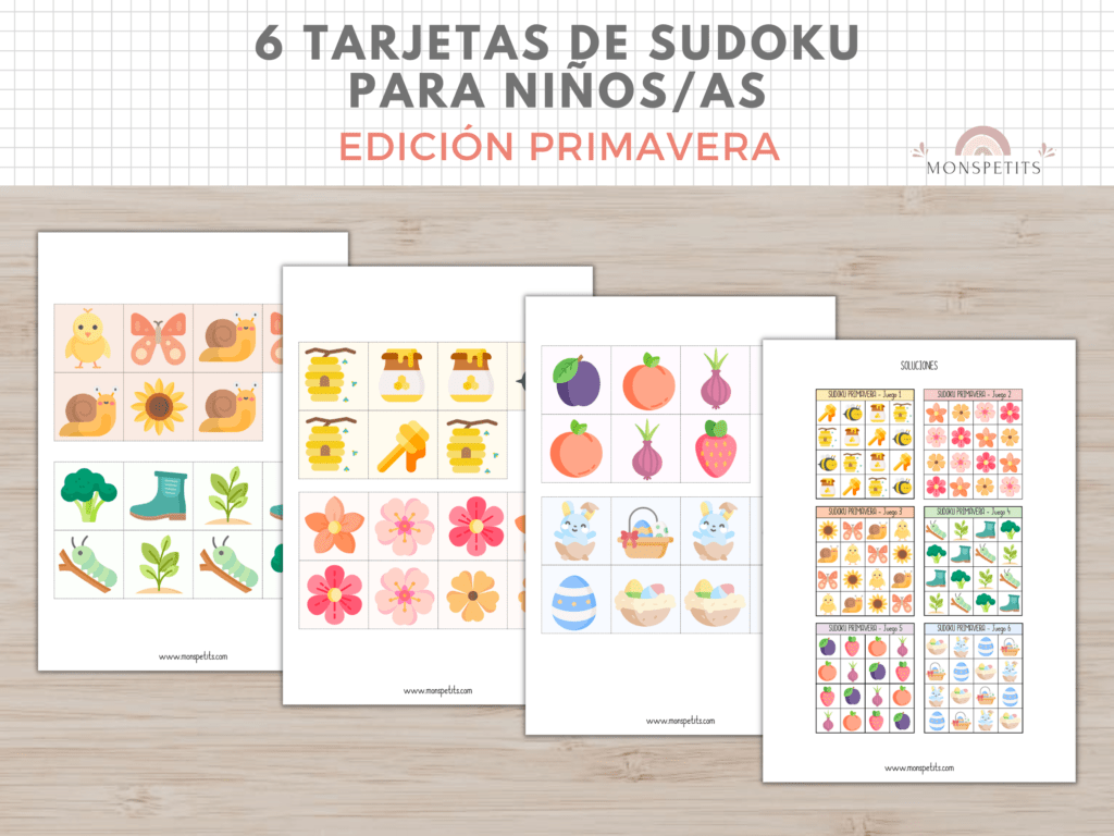 Estos sudokus imprimibles visuales con imágenes de primavera son fáciles de descargar e imprimir, y se pueden utilizar en casa o en el aula. Las imágenes incluyen elementos de la naturaleza y de la primavera como flores, abejas, mariposas y pájaros, lo que permite a los niños y niñas aprender vocabulario de esta estación mientras juegan.