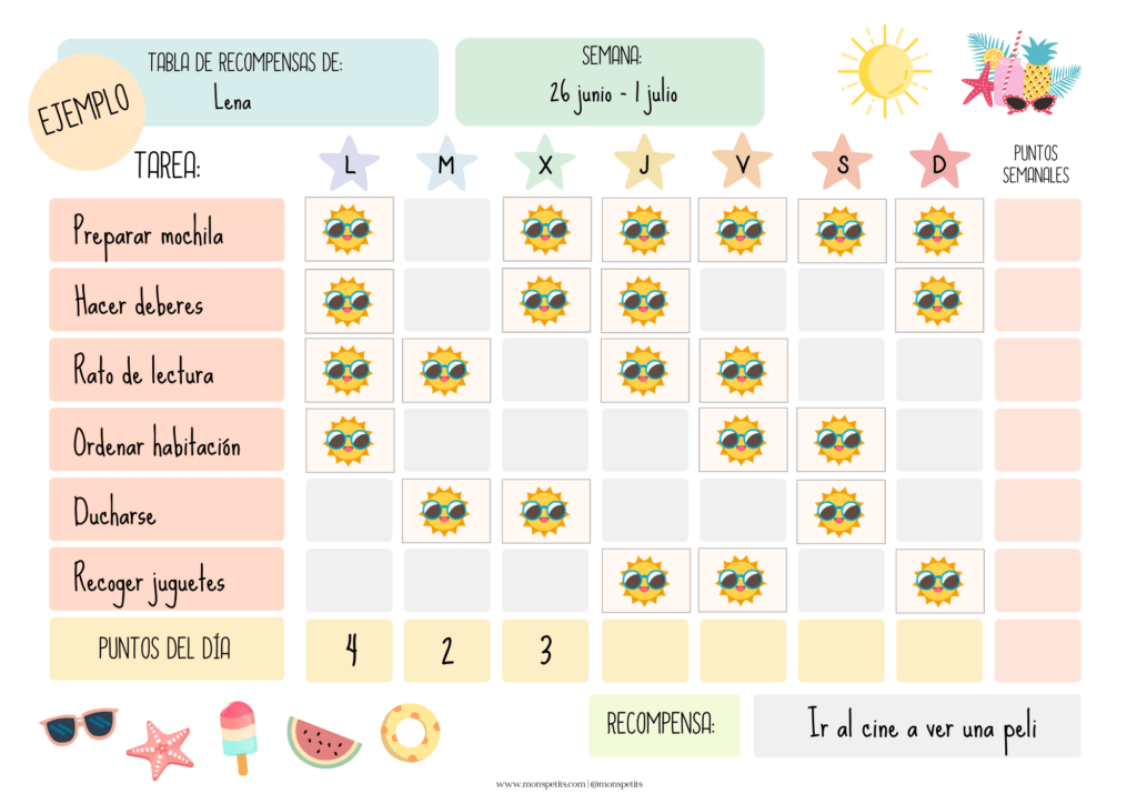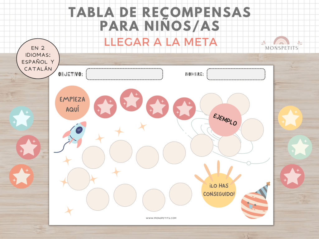Una tabla de recompensas o sistema de puntos es una herramienta visual que ayuda a los niños y niñas a establecer metas, cumplir tareas y desarrollar habilidades positivas. Funciona mediante la asignación de puntos o estrellas cada vez que se completa una tarea o se logra un comportamiento deseado. Estos puntos se pueden acumular y canjear por recompensas predeterminadas. En esencia, es un sistema de incentivos diseñado para motivar a los niños y niñas a mantenerse responsables y lograr sus objetivos.