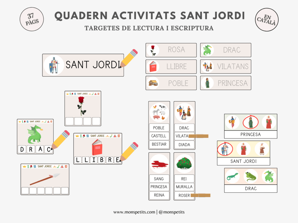 Dentro del cuaderno encontrarás una gran variedad de elementos, como flashcards de vocabulario, tarjetas de escritura, tarjetas de lectura, dibujos para buscar cosas, puntos de libro, un dominó y actividades de creatividad. Esta diversidad permite a los niños y niñas explorar diferentes aspectos de la leyenda y la cultura de Sant Jordi, desde el enriquecimiento del vocabulario hasta la práctica de la expresión escrita y la comprensión lectora.