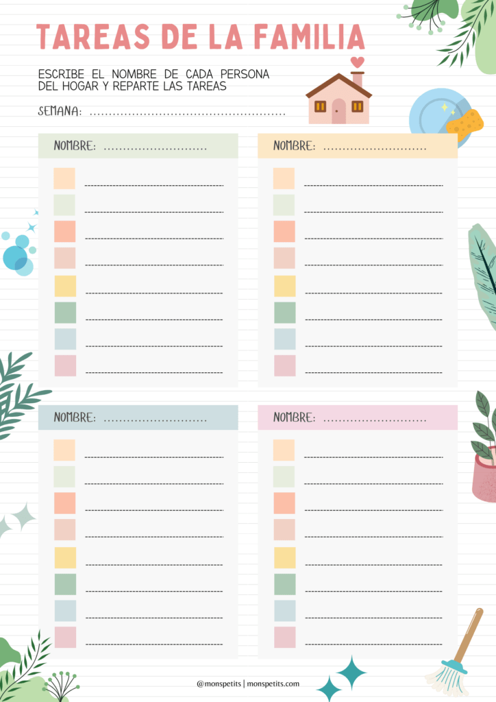 Encuentra formas de hacer que las tareas sean divertidas y emocionantes para tus hijos/as. Puedes convertir la limpieza en un juego o establecer pequeñas recompensas por completar las tareas de manera efectiva. Puedes usar plantillas para organizar las tareas que sean divertidas y adecuadas a su edad, que les brinden una clara idea de lo que se espera de ellos/as y que les motiven para querer colaborar.