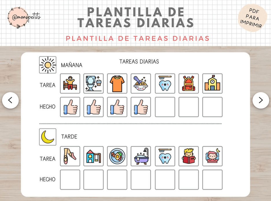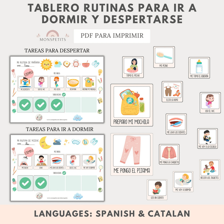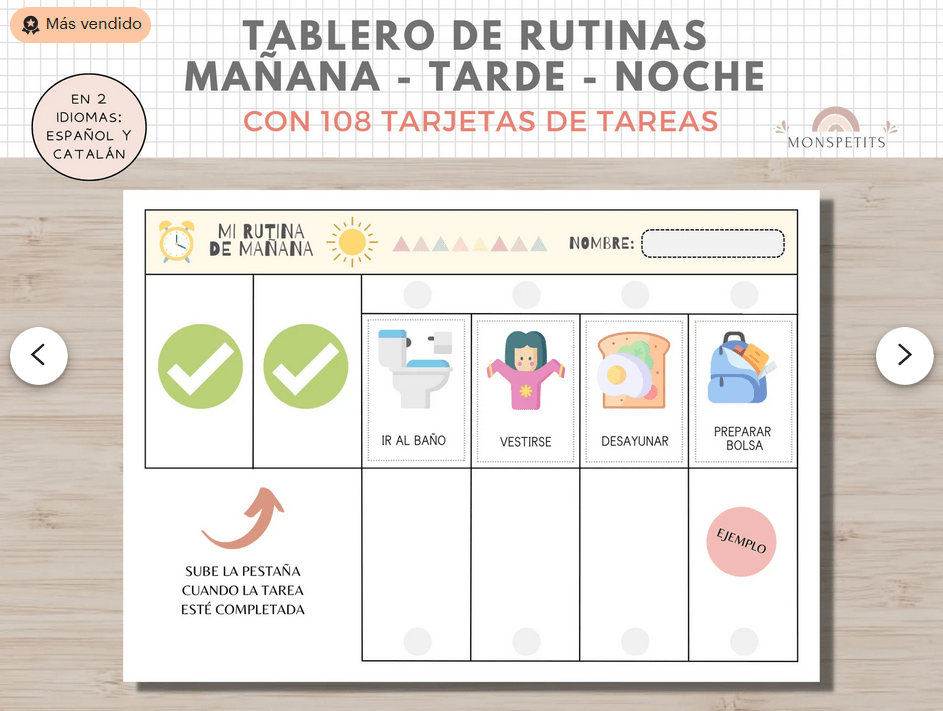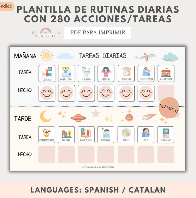 Los tableros de rutinas son una herramienta visual que ayuda a los niños y niñas a comprender y seguir el orden de sus actividades diarias. Desde la mañana hasta la noche, un tablero de rutinas muestra cada tarea que deben realizar, como lavarse los dientes, vestirse, hacer la tarea y prepararse para dormir. Este tipo de imprimible fomenta la independencia en los pequeños y también reduce las repeticiones y recordatorios constantes por parte de los padres.