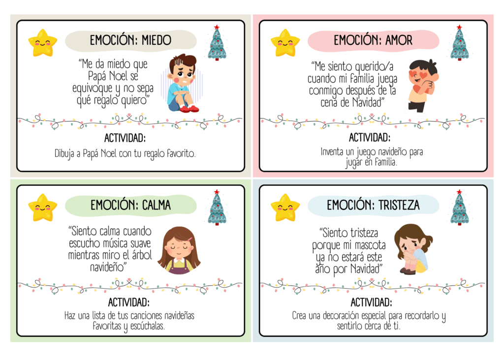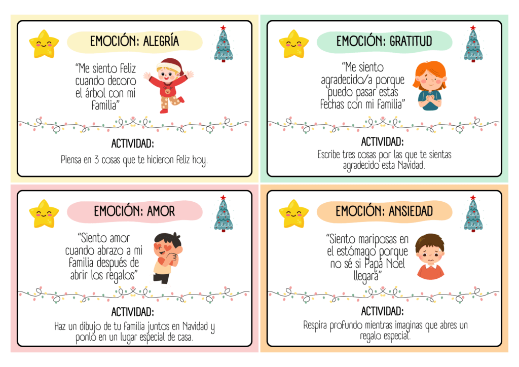 Dedica un momento tranquilo para mirar las tarjetas junto a tus hijos o hijas. Puedes elegir una emoción al azar o seleccionar las que creas que más les resonarán en ese momento. ¡Es una forma genial de iniciar conversaciones sobre cómo se sienten en Navidad!
