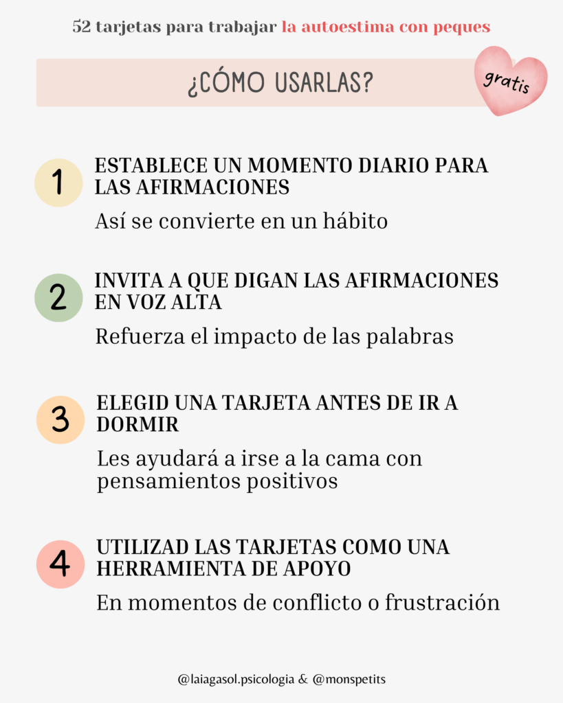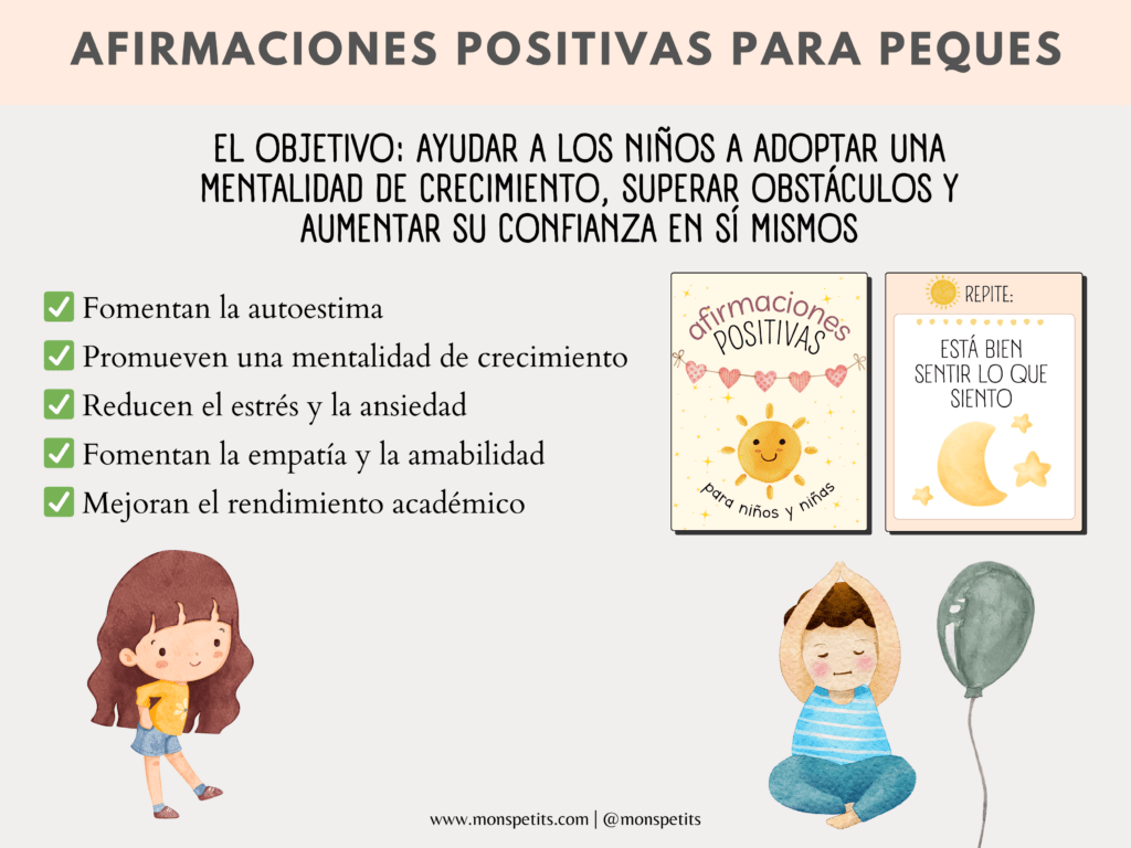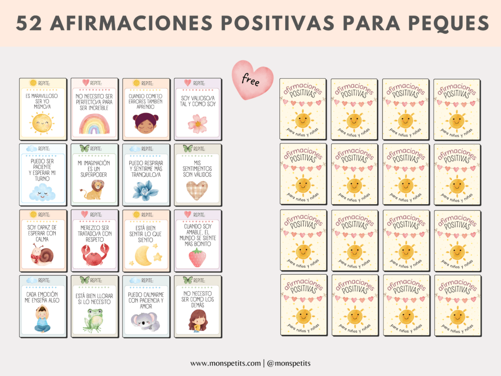En este artículo, Laia de @laiagasol.psicologia y yo @monspetits os hablaremos de qué son las afirmaciones positivas, cómo pueden beneficiar a los niños y niñas, cómo utilizarlas de manera efectiva en su vida diaria y, al final, os ofreceremos un regalo muy especial: 52 tarjetas de afirmaciones positivas listas para imprimir y trabajar con los más pequeños. Estas tarjetas ayudarán a fomentar una actitud positiva, fortalecer la autoestima y, en última instancia, contribuir a una mejor salud mental desde una edad temprana.