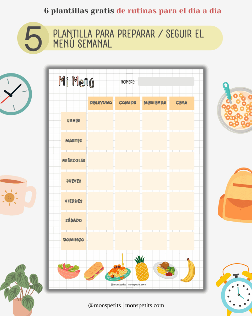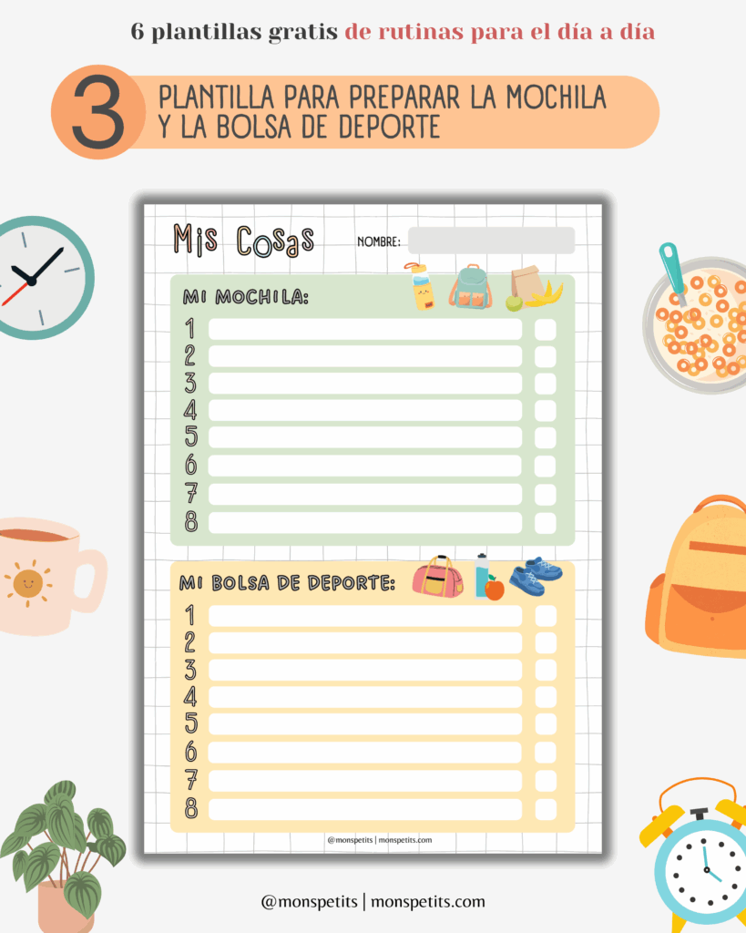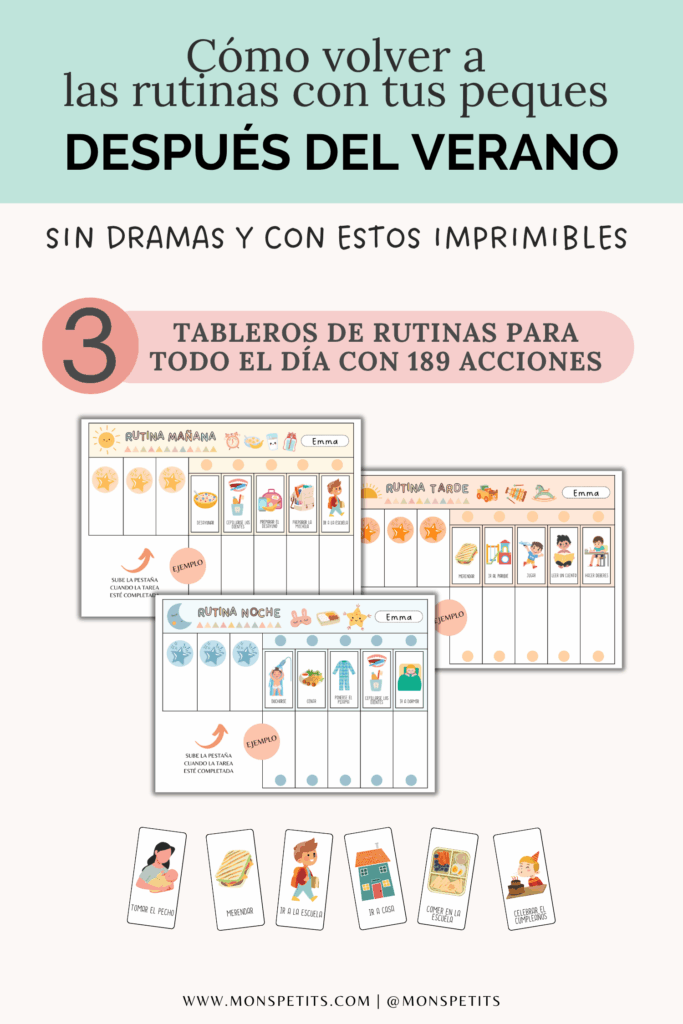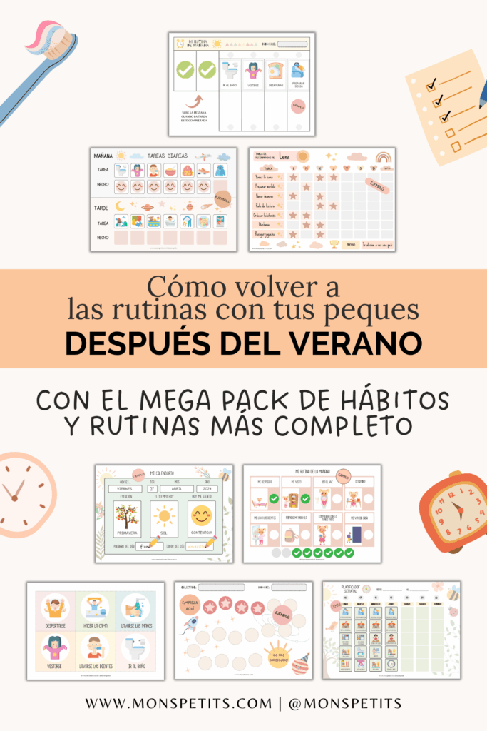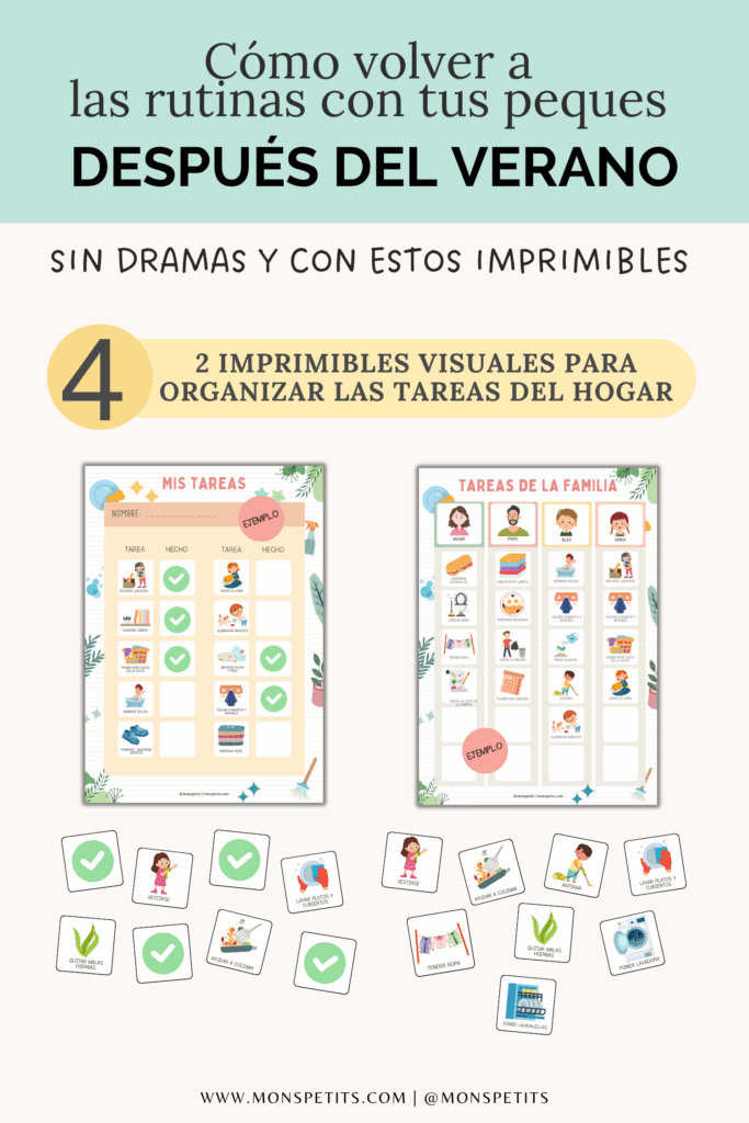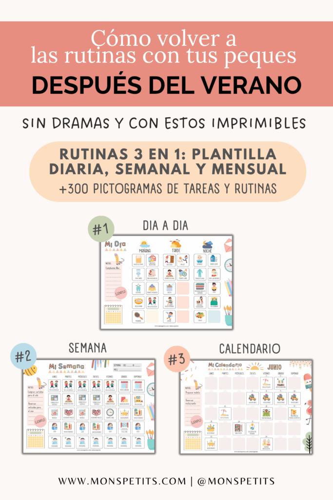 Si tu peque aún no sabe leer ni escribir, sigue leyendo para descubrir plantillas visuales llenas de dibujos y pictogramas. He creado un paquete de imprimibles de rutinas, hábitos y tareas que te lo pone fácil para acompañar a tus peques (¡y a ti misma!) en este proceso. Es visual, práctico y muy flexible.
