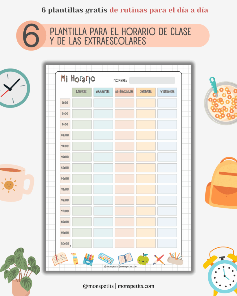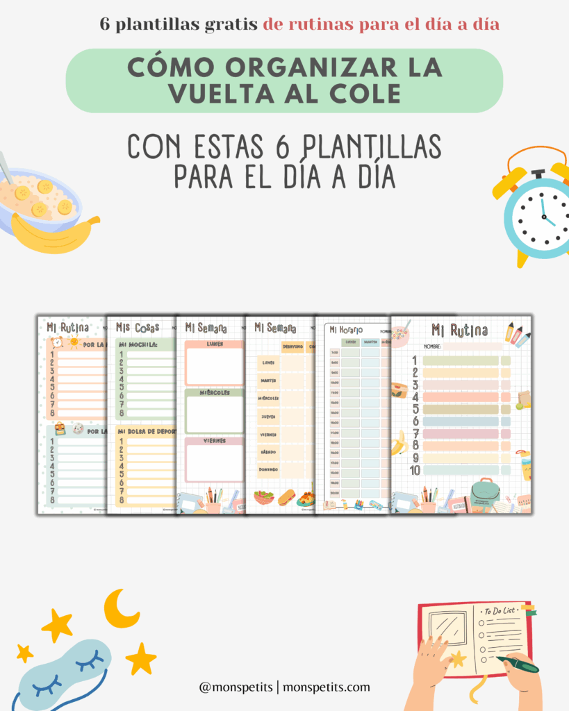 En este post quiero darte consejos prácticos para que la vuelta al cole sea más fluida, y además te regalo un pack de 6 plantillas imprimibles en PDF que podéis colgar en casa (en la habitación, la nevera o un corcho) para que tengan siempre a mano sus rutinas, horarios y tareas.