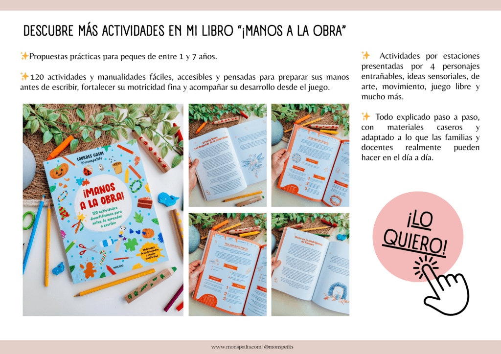 Descubre 120 actividades y manualidades en mi libro ¡Manos a la obra! Actividades para antes de coger un lápiz, pensado para familias, docentes y personas que acompañan a peques de entre 1 y 7 años.