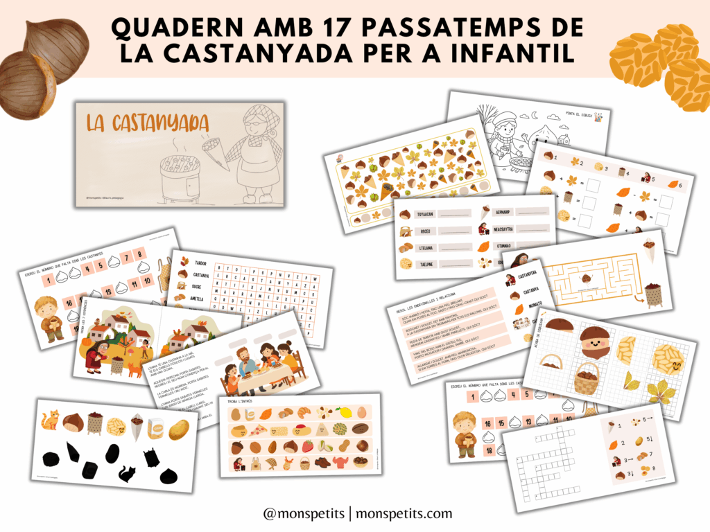 Per això, @monspetits juntament amb @lauric.pedagogia, hem creat un nou imprimible amb 17 passatemps de la Castanyada pensat especialment per a l’etapa d’educació infantil (3 a 6 anys).