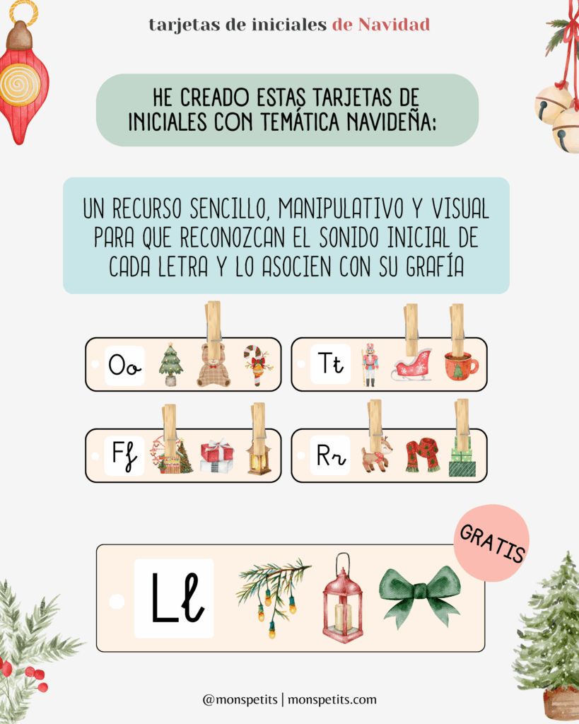 Si quieres trabajar la conciencia fonológica esta Navidad de forma lúdica y significativa, puedes descargar las tarjetas navideñas de sonidos iniciales de forma gratuita.