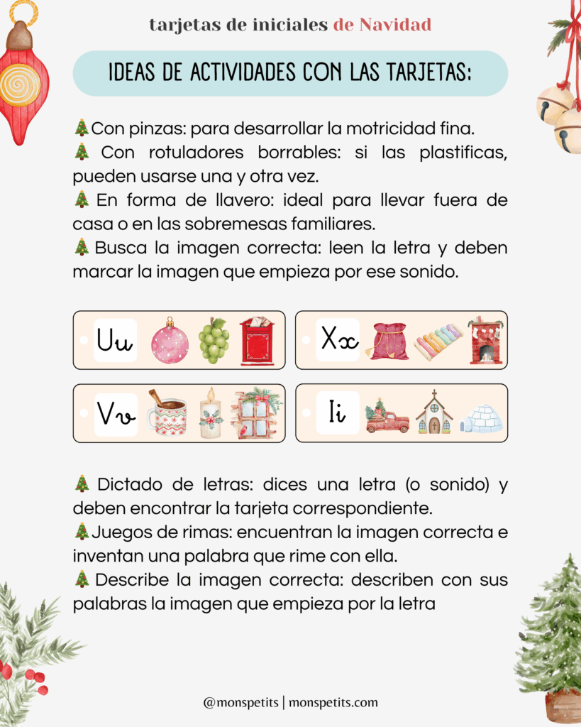 👉 Al final del post podrás descargar un imprimible gratuito con tarjetas navideñas para trabajar el sonido inicial de las letras.