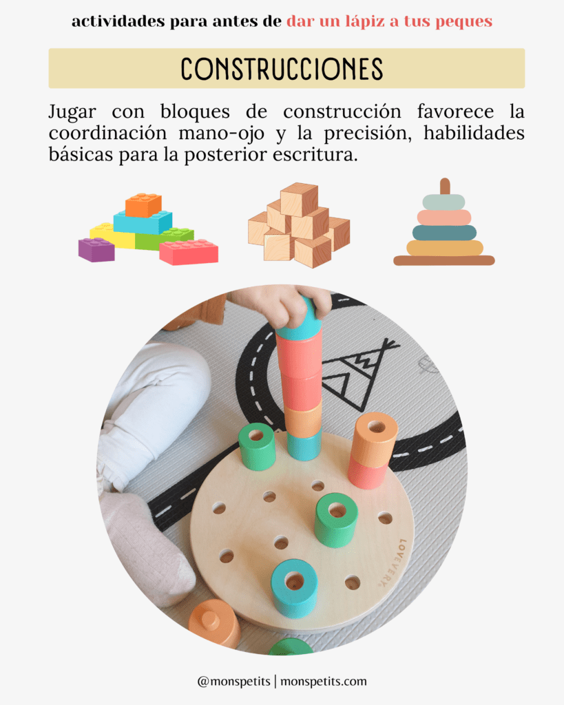 Los juegos de construcción trabajan coordinación óculo-manual, planificación y precisión. Son actividades previas fundamentales para el control fino.