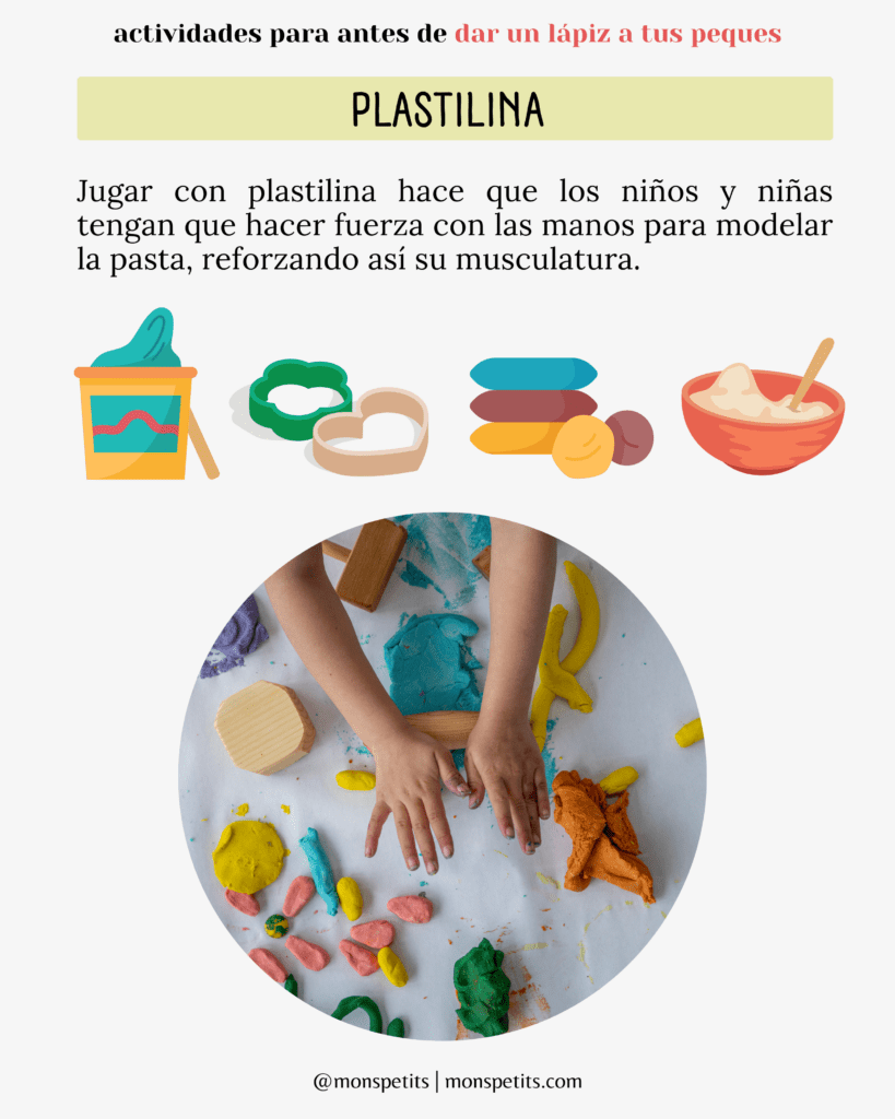 La plastilina es uno de los mejores recursos para trabajar la motricidad fina antes de escribir. Al amasar, pellizcar y modelar, se activa toda la musculatura de la mano.