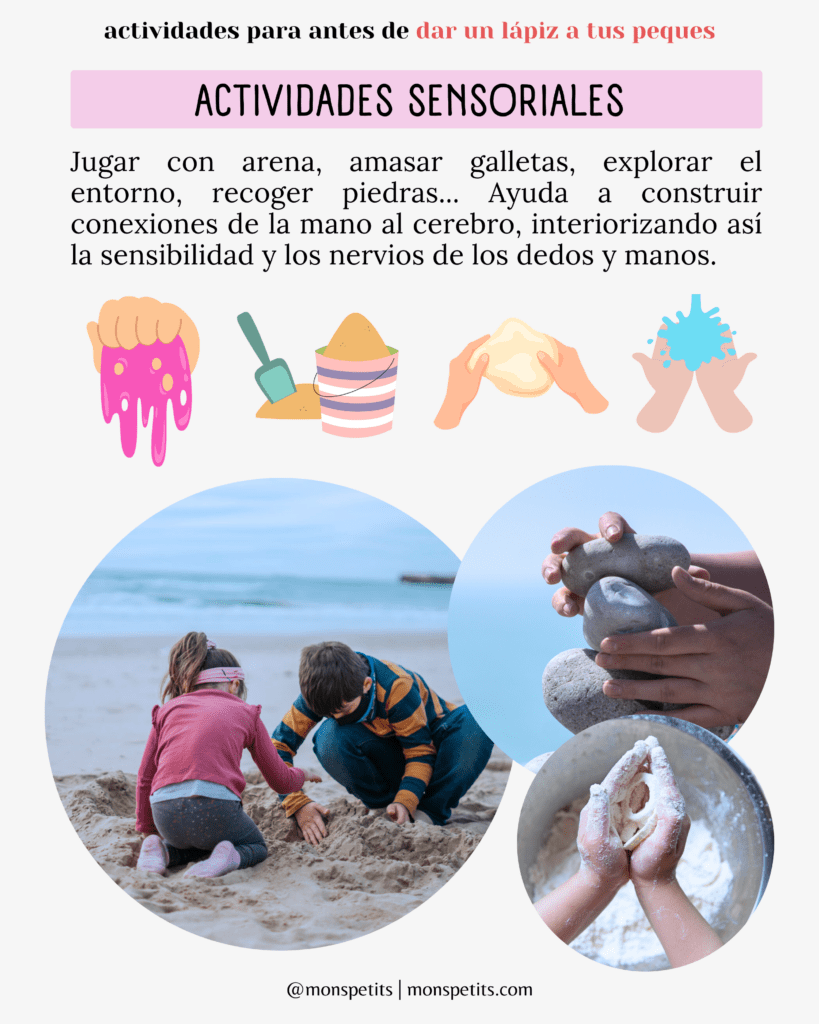 La escritura también es sensorial. Necesitamos que el cerebro integre la información táctil de manos y dedos. Las actividades sensoriales ayudan a construir la conciencia corporal necesaria para la precisión posterior.