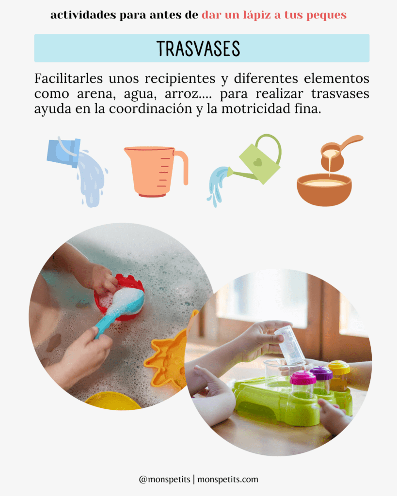 Los trasvases desarrollan control, coordinación y dosificación del movimiento. Aquí se entrena el control del movimiento y la precisión de la muñeca.