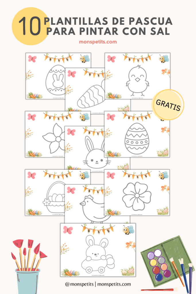 Además, he preparado unas plantillas imprimibles de Pascua que puedes utilizar de varias maneras según la edad: para pintar con sal, para trabajar el contorno con gomets o para repasar el trazo con rotuladores de punta redonda.