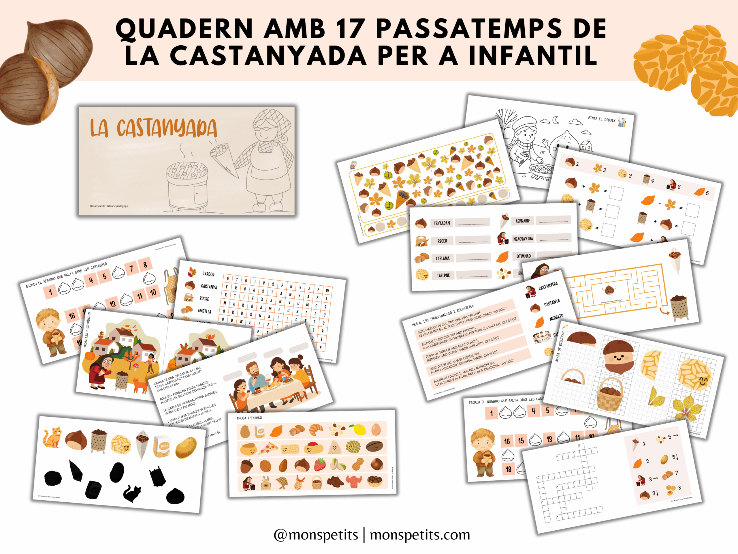 Quadern de passatemps de la Castanyada per a educació infantil La Castanyada és una de les festes més estimades a les escoles i a casa. L’olor de les castanyes, el gust dels panellets i les cançons de la castanyera ens omplen la tardor de màgia, colors i moments per compartir en bona companyia. Per això, @monspetits juntament amb @lauric.pedagogia, hem creat un nou imprimible amb 17 passatemps de la Castanyada…
